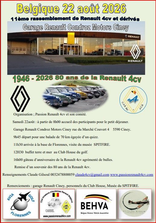 2026 ; (international) 11 èm rassemblement de Renault 4cv et dérivés, la renault 4cv fêtera ses 80 ans.